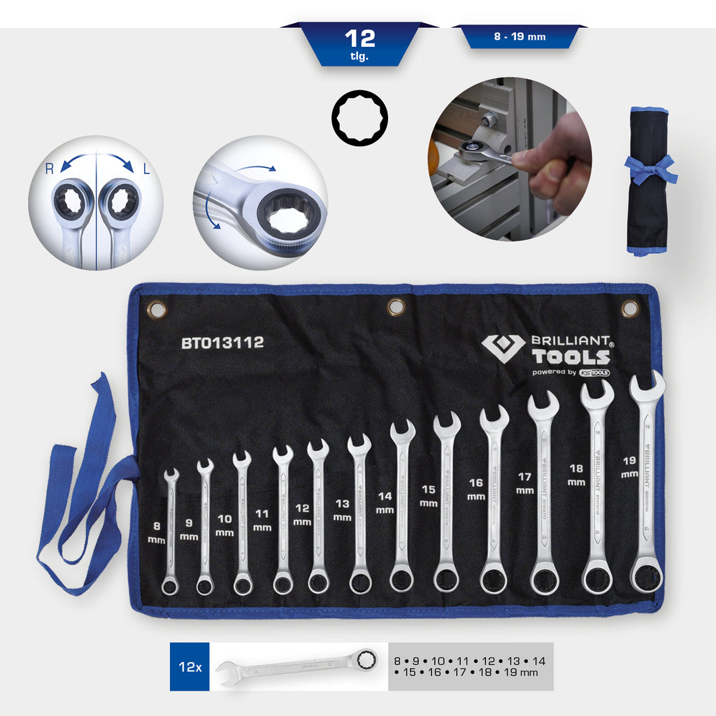 De 12-delige BRILLIANT TOOLS ratelringsleutelset BT013112 wordt geproduceerd volgens DIN 3113. De metrische ringsleutels met ratelfunctie hebben een fijne vertanding met 72 tanden en hebben een terughaalhoek van 5°. De sleutels hebben een rechte vorm en een 15° bekstand. De omschakeling van de ratelfunctie (rechtsom/linksom) gebeurt door het omdraaien van de sleutel. Het oppervlak is matverchroomd, hierdoor ligt hij ook zeer goed in de hand. De ratelringsleutelset met de maten 8 mm tot en met 19 mm, wordt in een praktische opbergtas met ophangogen geleverd.