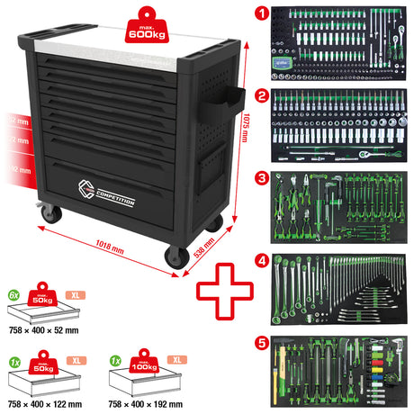 COMPETITION gereedschapswagen met 8 laden en 434-dlg Premium gereedschap