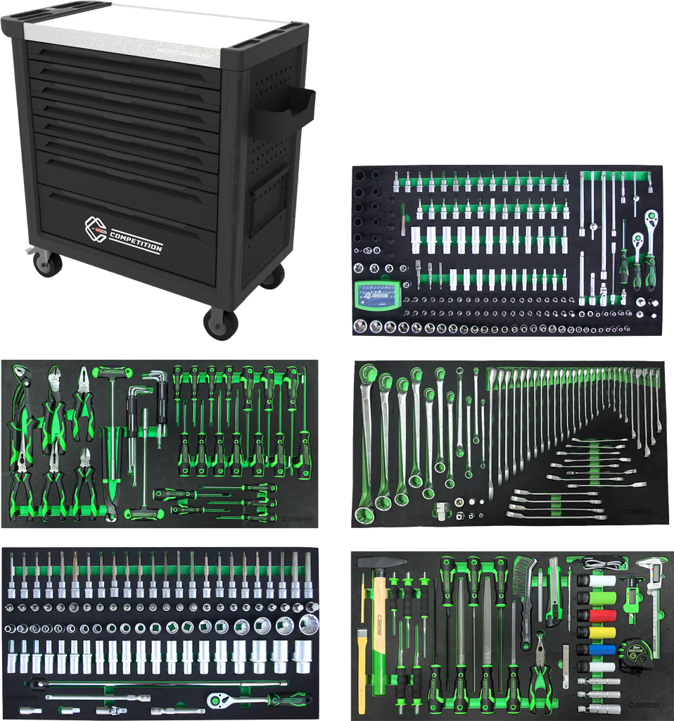 De Competition gereedschapswagen met 434-delig premium gereedschap is een complete en professionele oplossing voor iedere werkplaats, garage of hobbyruimte. Deze robuuste gereedschapskar is voorzien van 8 volledig gevulde laden, overzichtelijk ingedeeld met hoogwaardige schuiminlays. Alles wat je nodig hebt, altijd direct binnen handbereik.